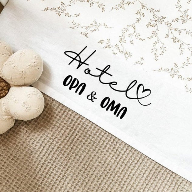 Baby lakentje voor ledikantbed met opschrift 'hotel opa en oma'.